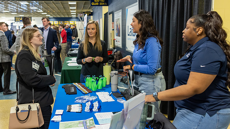 Caitlyn Kelly, a business management senior, talks with employees from Sherwin-Williams at the Spring 2026 Job Fair.